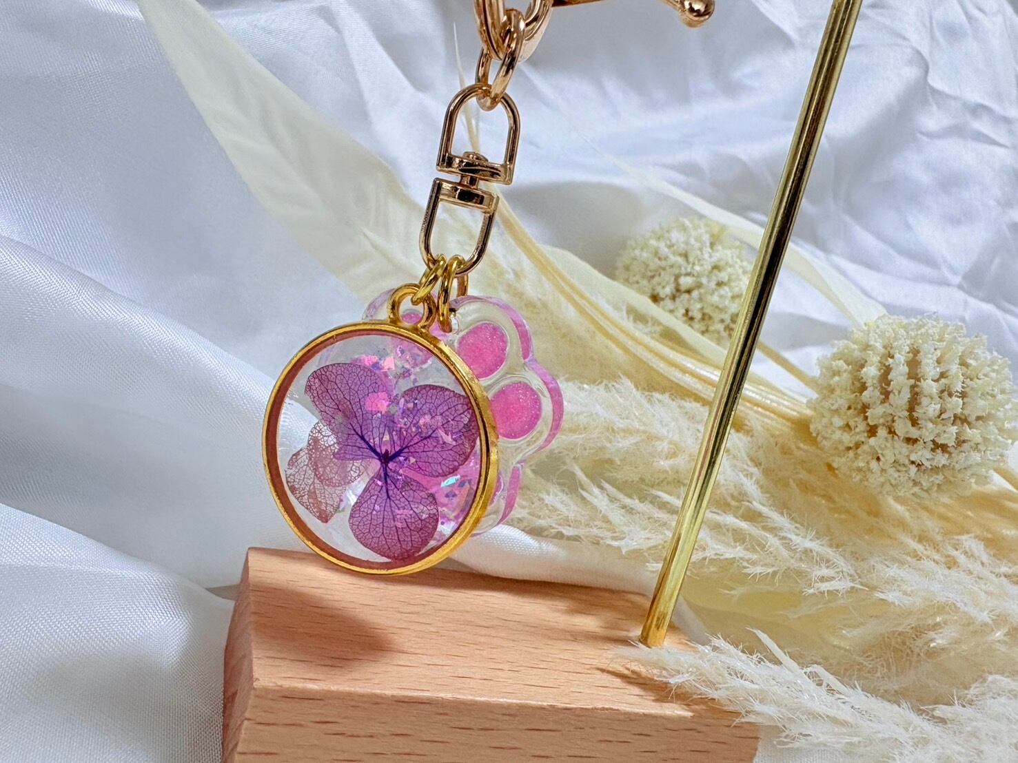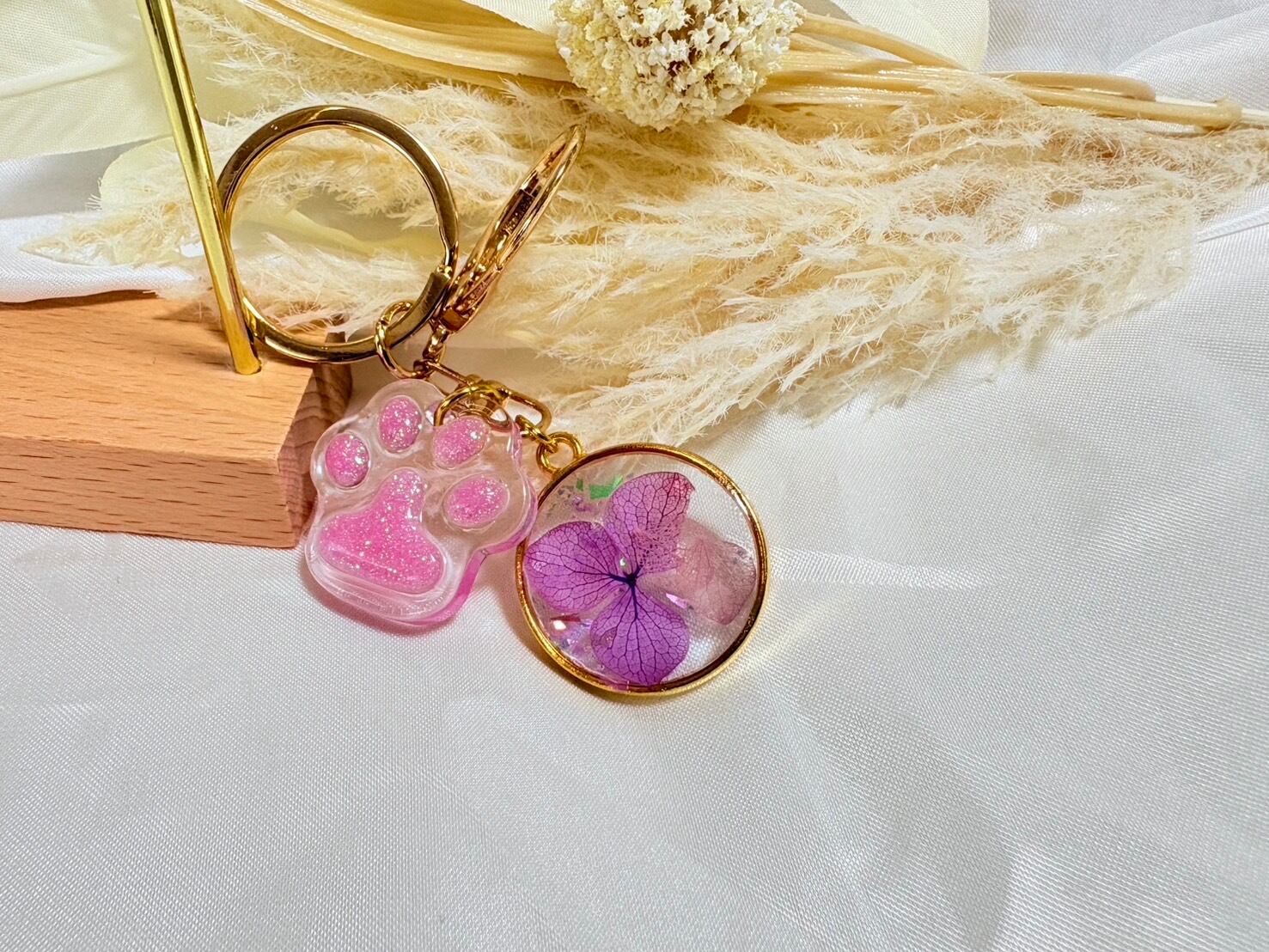 - デザイン: 紫の肉球型チャームと紫の花のチャーム